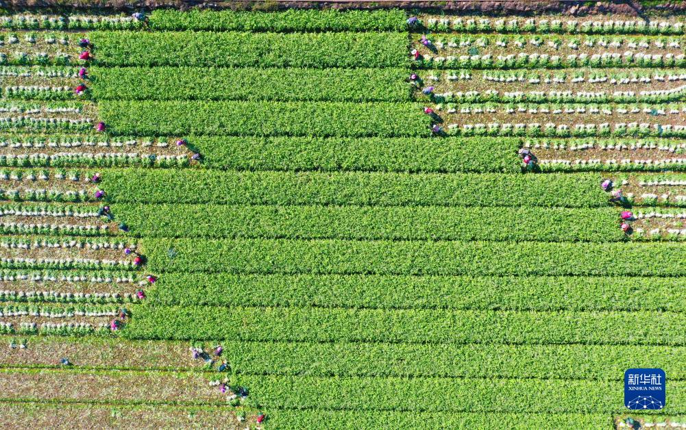 11月22日,在浙江省溫嶺市石橋頭鎮(zhèn)蔬菜基地,農(nóng)民在采收高腳白菜(無(wú)人機(jī)照片)。