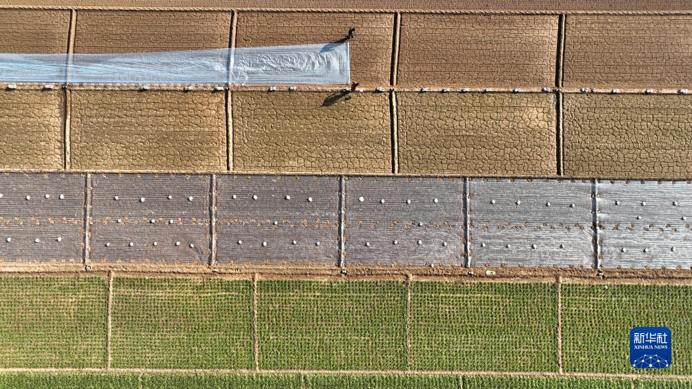 11月22日,農(nóng)戶(hù)在河北省石家莊市藁城區(qū)常安鎮(zhèn)里莊村菜田鋪設(shè)地膜(無(wú)人機(jī)照片)。