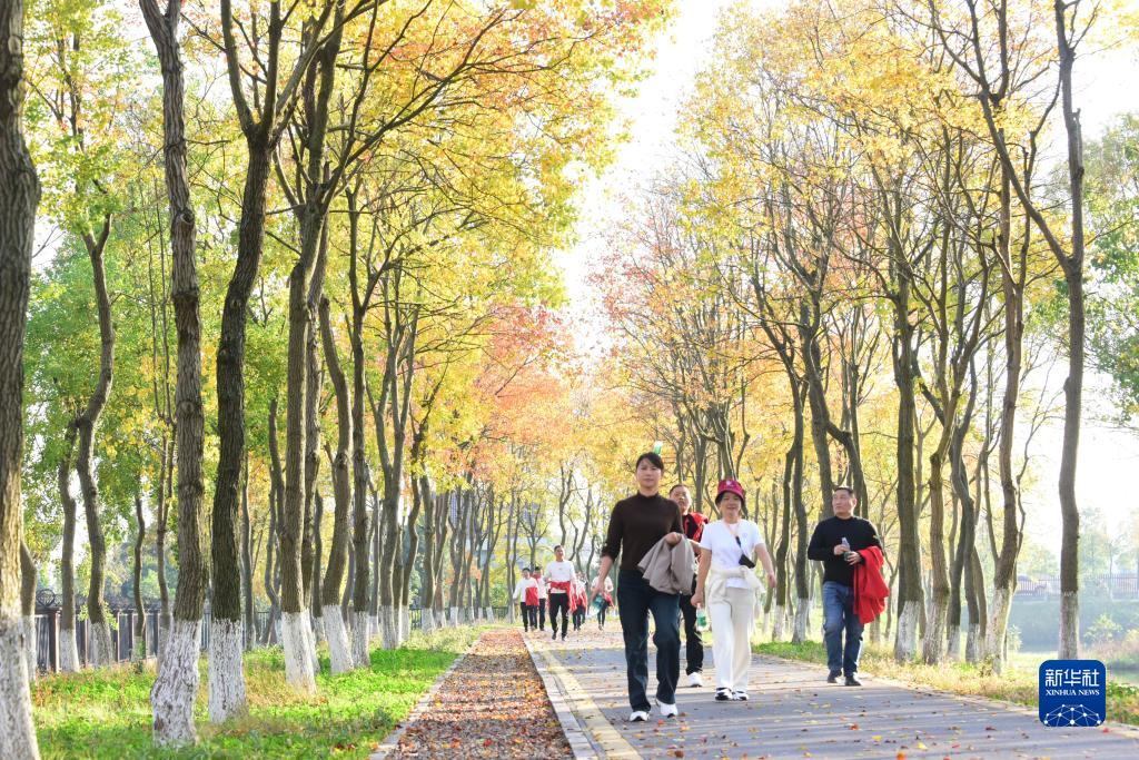 11月21日,游客在湖南省常德市澧縣城頭山國(guó)家考古遺址公園烏桕廊道里漫步。