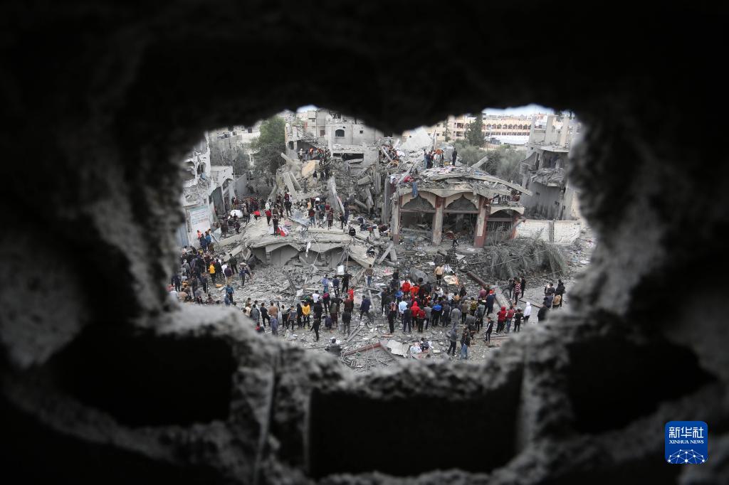 11月22日,人們在加沙地帶南部城市拉法的建筑廢墟上實施救援。