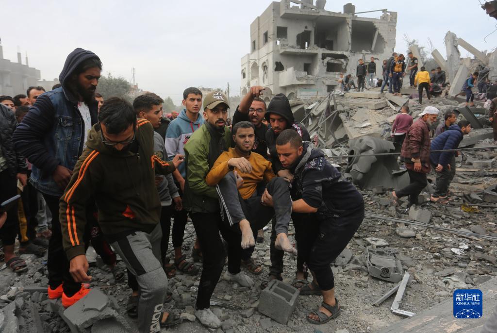 11月22日,人們在加沙地帶南部城市拉法的建筑廢墟上實施救援。