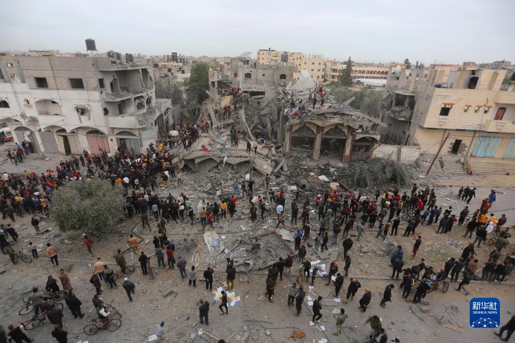 11月22日,人們在加沙地帶南部城市拉法的建筑廢墟上實(shí)施救援。