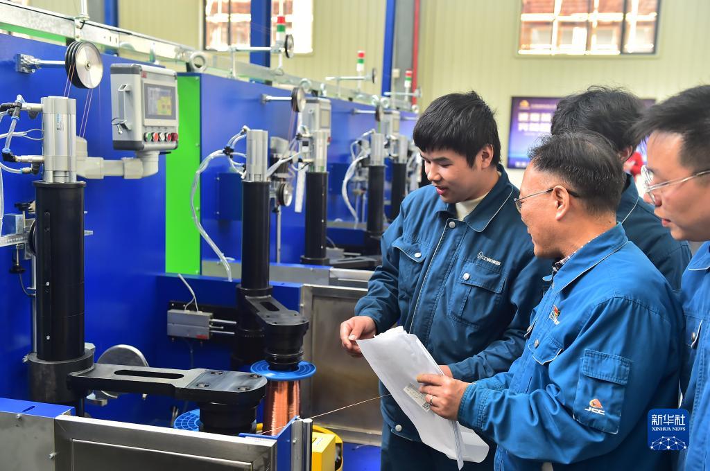 11月21日,在江西江銅華東電工新材料科技有限公司生產車間,技術工人在生產線上探討技術問題。