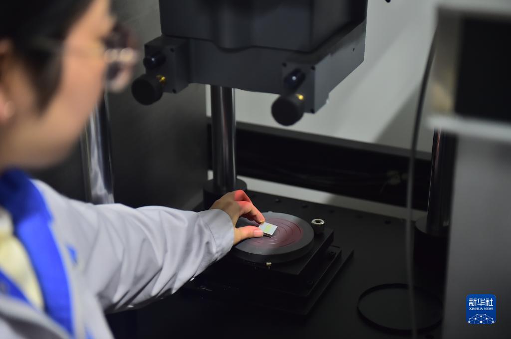 11月21日,在江西水晶光電科技有限公司實驗室,技術人員在進行光學元器件產品檢驗。