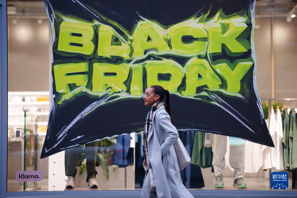 11月22日,在英國(guó)曼徹斯特,一名女子走過(guò)“黑色星期五”促銷廣告。
