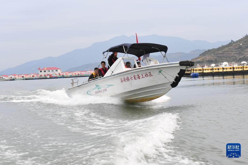 11月14日,福建省寧德市霞浦縣溪南鎮七星海上社區工作人員乘坐快艇前往轄區漁排進行民情走訪。