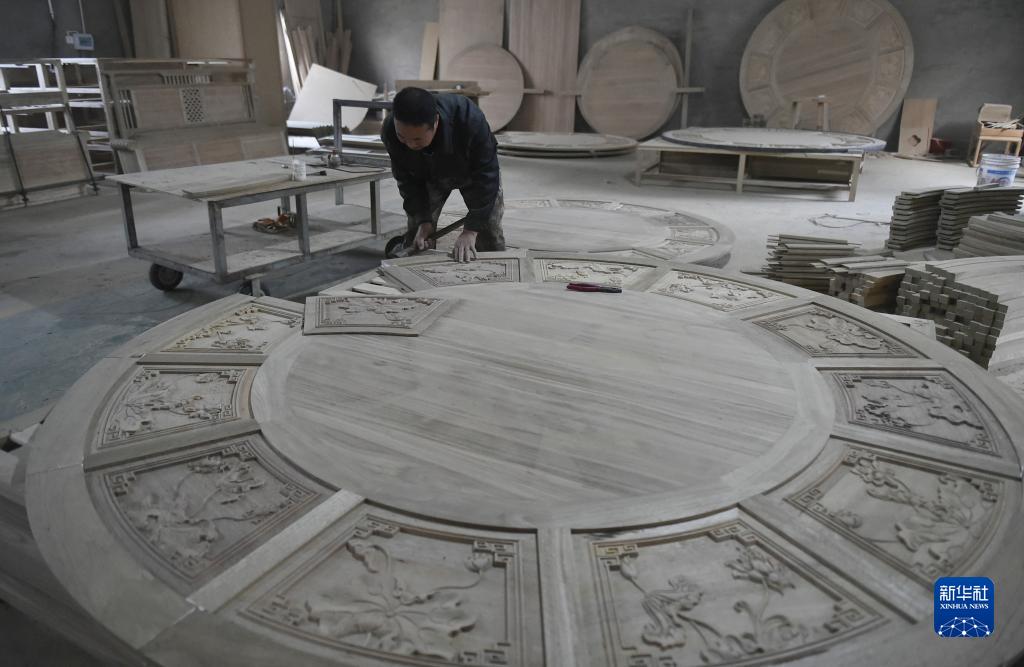 11月22日,工人在滑縣半坡店古典家具特色小鎮內一家企業的生產車間制作家具。