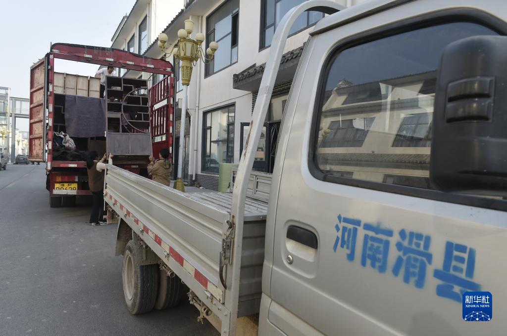 11月22日,在滑縣半坡店古典家具特色小鎮(zhèn),商戶將家具裝車準備外銷。