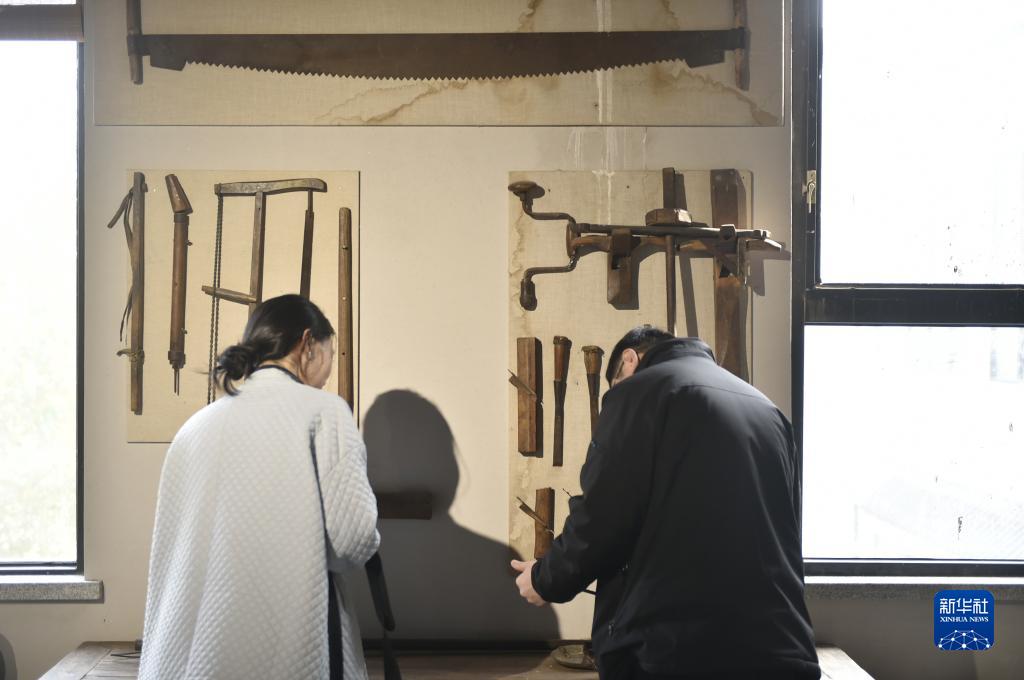 11月22日,來訪者在滑縣半坡店古典家具特色小鎮(zhèn)的家具博物館參觀。