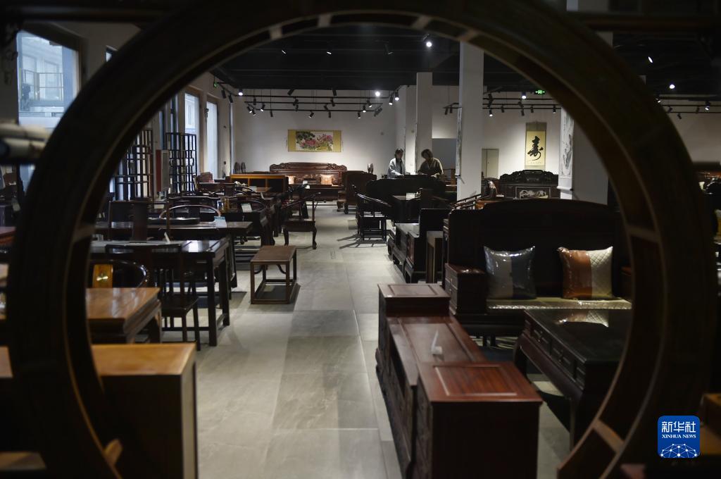11月22日在滑縣半坡店古典家具特色小鎮(zhèn)拍攝的一家企業(yè)的家具展廳。
