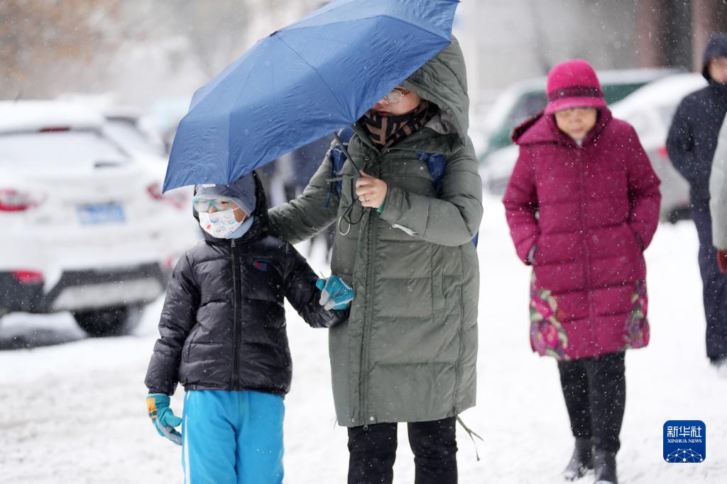 11月23日,哈爾濱市民在雪中送孩子上學。