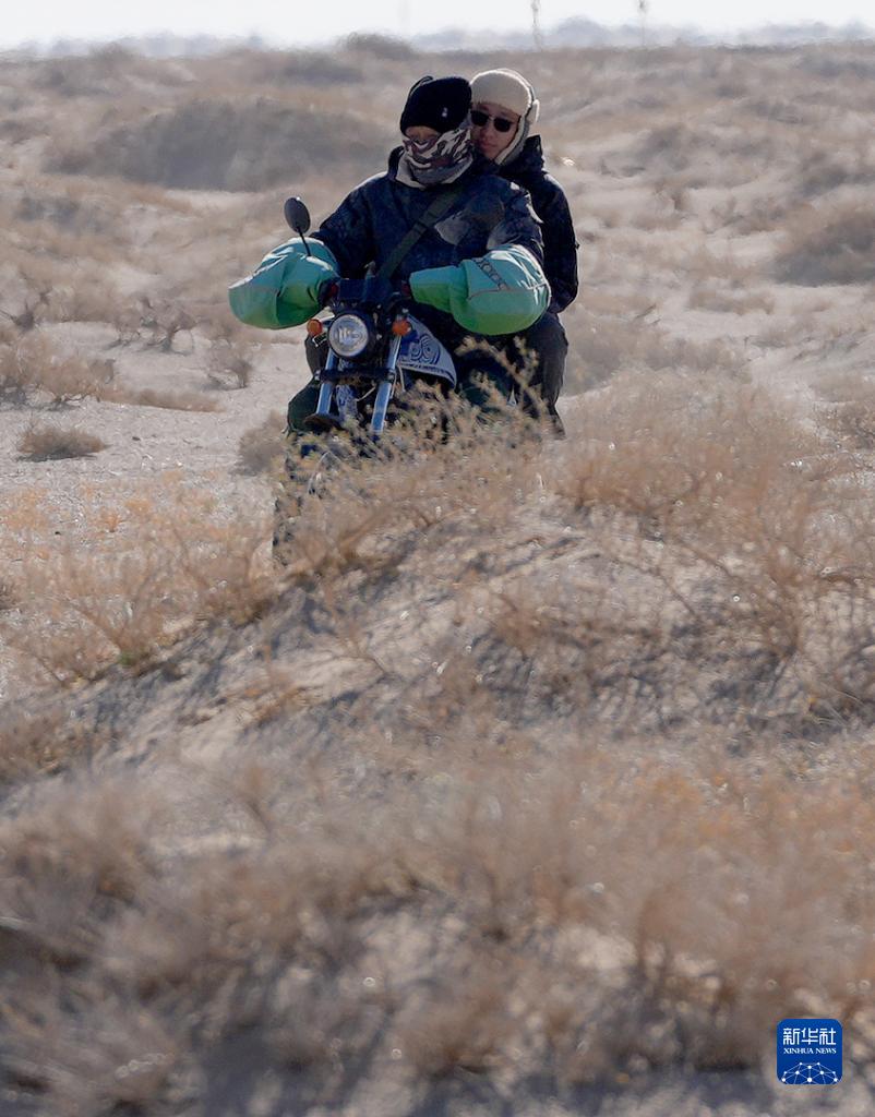 在內蒙古阿拉善左旗烏力吉蘇木溫都爾毛道嘎查,牧民朝勒門格爾勒(左)和兒子溫都蘇在邊境地區巡護(11月17日攝)。