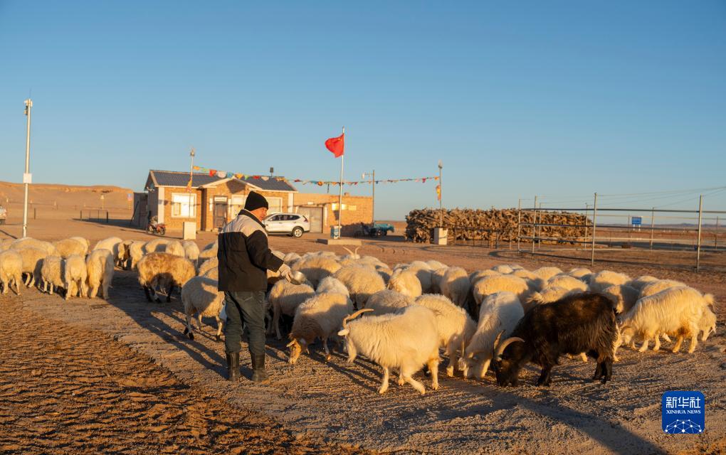 在內蒙古阿拉善左旗烏力吉蘇木溫都爾毛道嘎查,牧民朝勒門格爾勒在羊圈中喂羊(11月17日攝)。