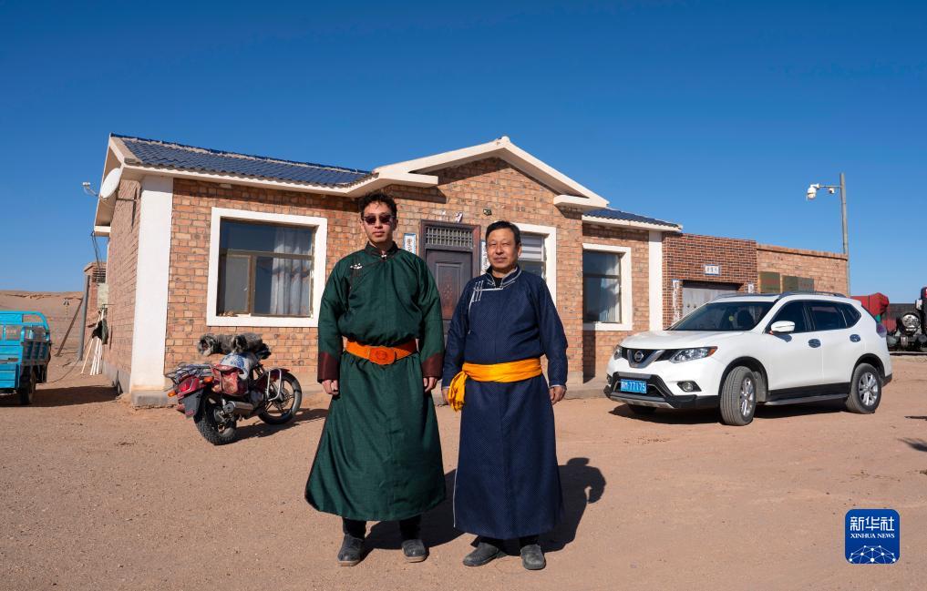 在內蒙古阿拉善左旗烏力吉蘇木溫都爾毛道嘎查,牧民朝勒門格爾勒(右)和兒子溫都蘇在家門口合影(11月17日攝)。