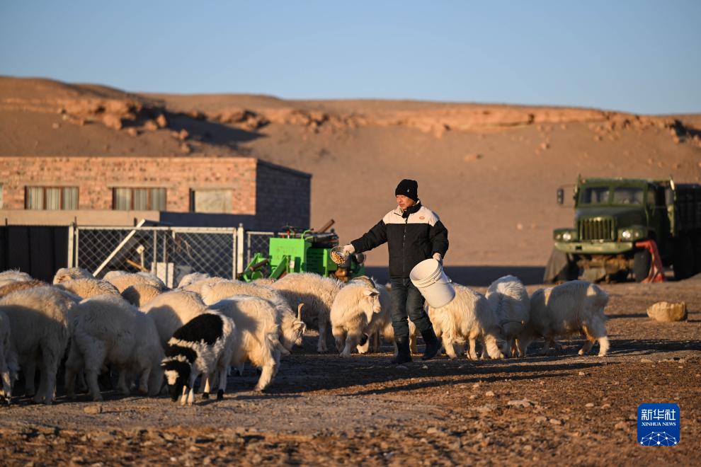 在內(nèi)蒙古阿拉善左旗烏力吉蘇木溫都爾毛道嘎查,牧民朝勒門格爾勒在喂羊(11月17日攝)。
