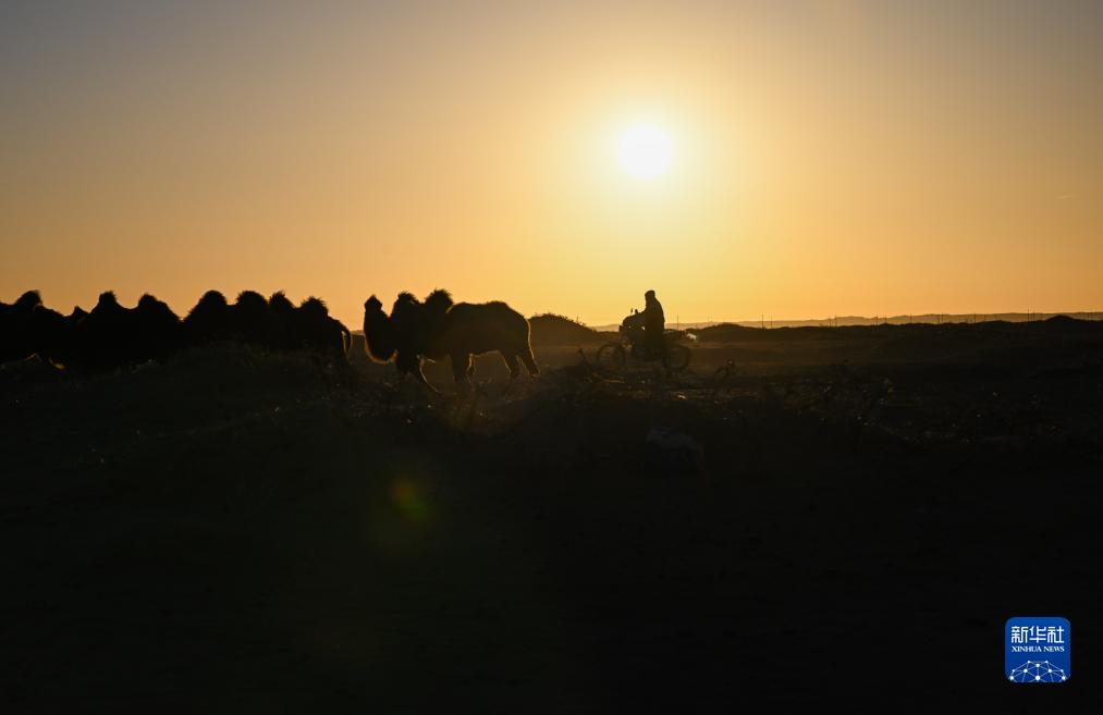 在內蒙古阿拉善左旗烏力吉蘇木溫都爾毛道嘎查,牧民朝勒門格爾勒在放駱駝(11月17日攝)。