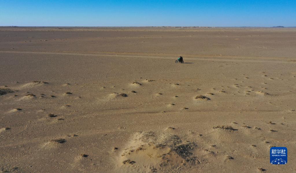 在內(nèi)蒙古阿拉善左旗烏力吉蘇木溫都爾毛道嘎查,牧民朝勒門(mén)格爾勒和兒子溫都蘇在巡護(hù)邊境區(qū)域(11月17日攝,無(wú)人機(jī)照片)。