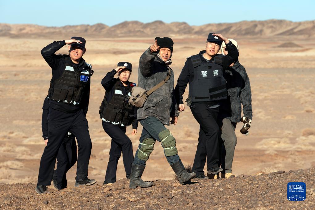 在內蒙古阿拉善左旗烏力吉蘇木溫都爾毛道嘎查,牧民朝勒門格爾勒(中)與阿拉善左旗邊境管理大隊的民警在邊境地區巡護(11月17日攝)。