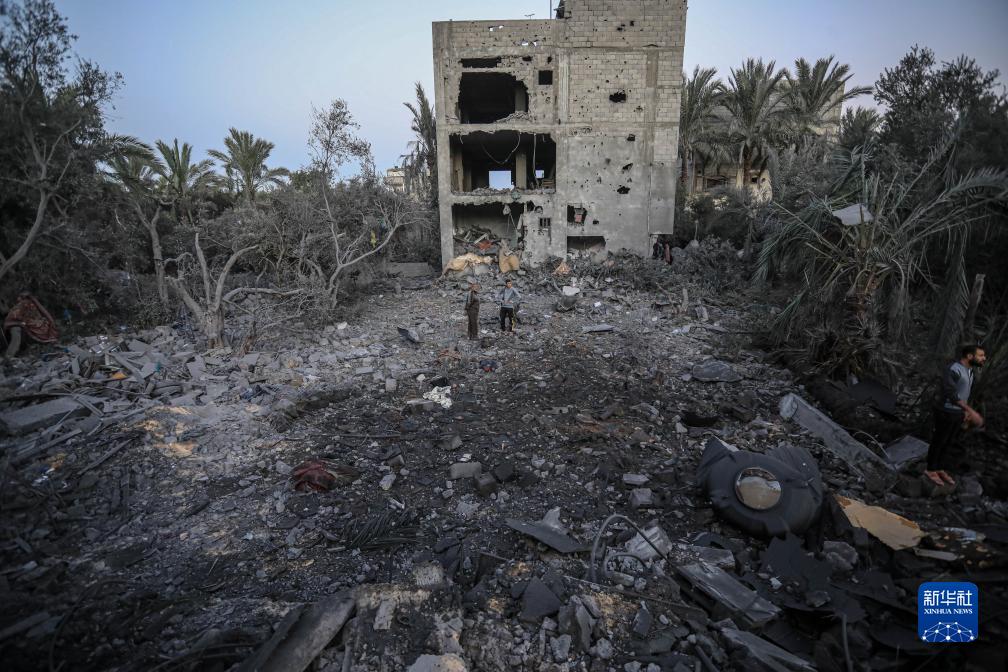 11月23日,在加沙地帶中部的代爾拜拉赫,巴勒斯坦人查看以軍空襲后的建筑廢墟。