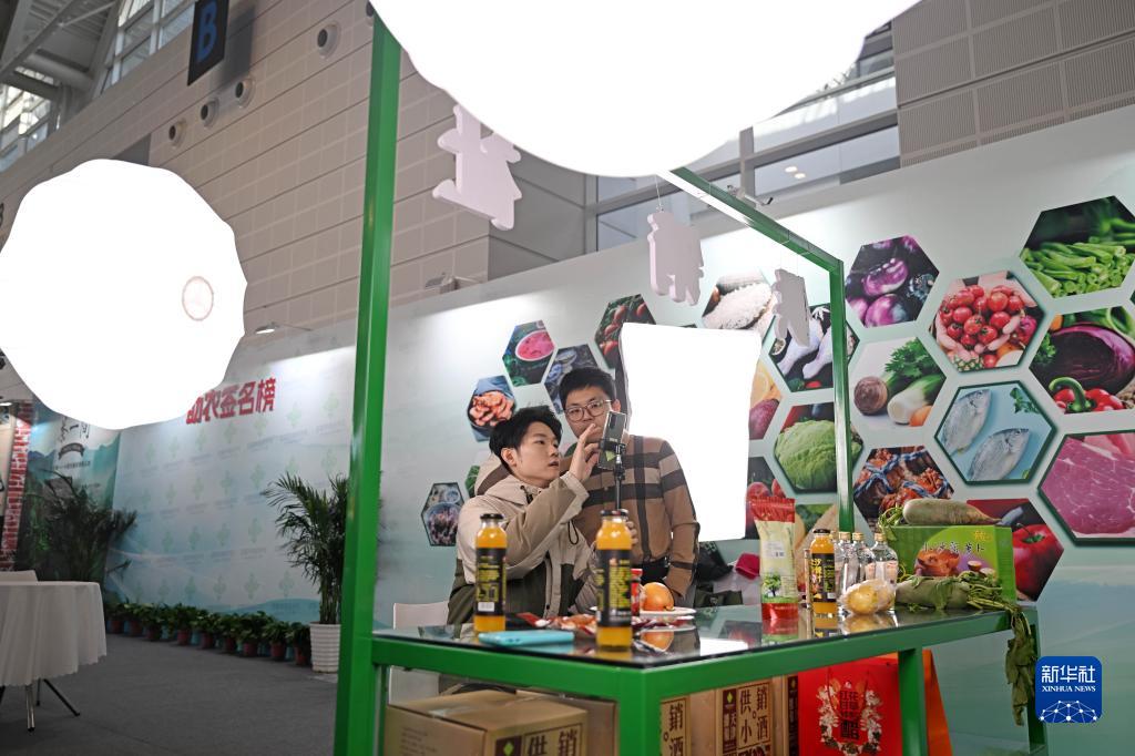 11月23日,參展商在國家會展中心(天津)優質農產品展區內進行直播。