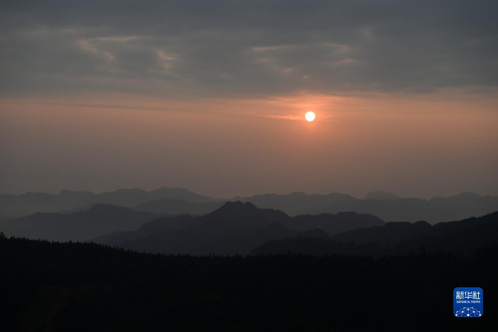 當日清晨,廣西樂業縣紅日初升,晨霧中的群山充滿詩情畫意。