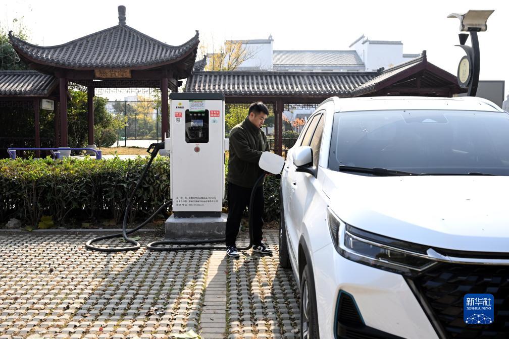 11月23日,在安徽省蚌埠市五河縣新集鎮一處新能源汽車公共充電站,一名車主在為汽車充電。