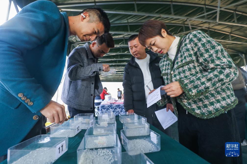 11月25日,在杭州市臨安區郎家村,評委在金獎大米評選環節為報名參賽的糧食生產基地打分。