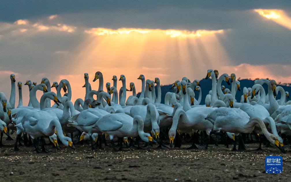 11月18日,在山東省榮成大天鵝國(guó)家級(jí)自然保護(hù)區(qū)天鵝湖湖畔,成群的大天鵝在漫步、覓食。