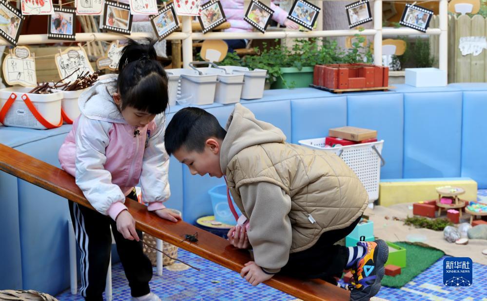 11月24日,在上海市實驗幼兒園,小朋友近距離觀察一只蟈蟈。