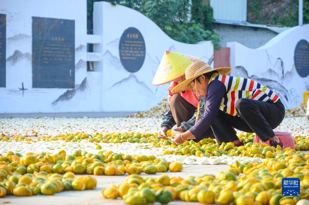 11月25日,在廣東省江門(mén)市新會(huì)區(qū)一處空地,人們對(duì)新會(huì)柑皮進(jìn)行翻皮晾曬。