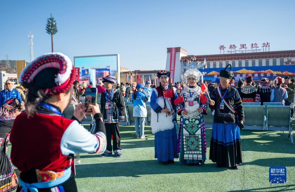 11月26日,參加麗香鐵路開通儀式的少數民族代表用手機拍照留念。目前,中國移動已實現麗香鐵路及沿線周邊區域4/5G信號100%覆蓋。