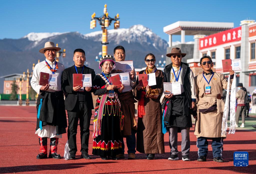 11月26日,參加麗香鐵路開通儀式的嘉賓在香格里拉站站前廣場手持紀念車票合影。
