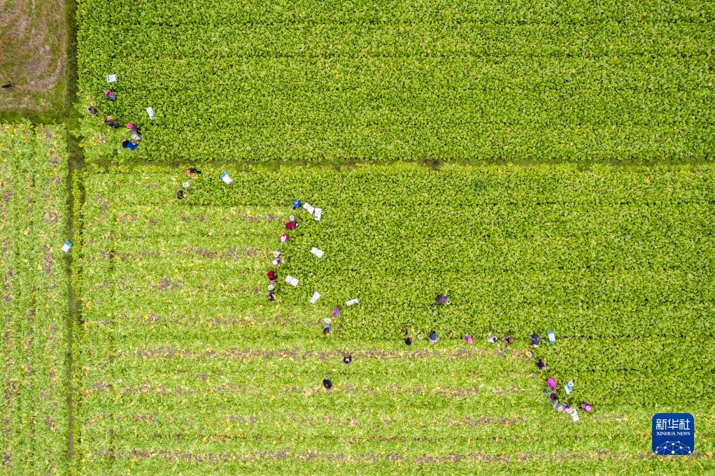 11月26日,在南縣武圣宮鎮太白洲村,菜農在采收榨菜(無人機照片)。