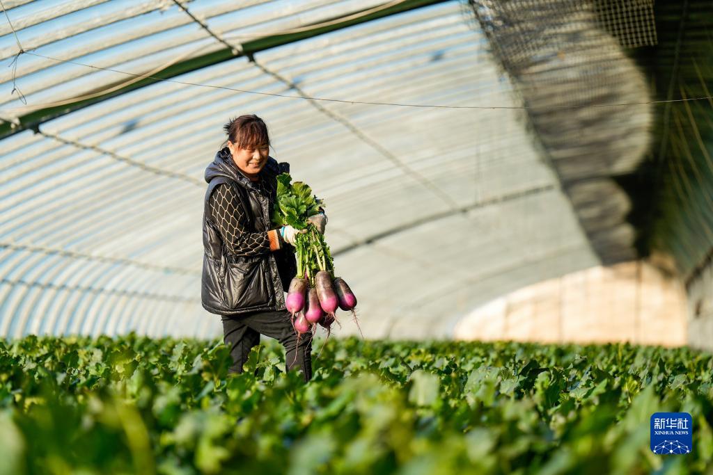 11月26日,河北省灤州市茨榆坨鎮(zhèn)蘆葦莊村農(nóng)民在大棚內(nèi)采收蘿卜。