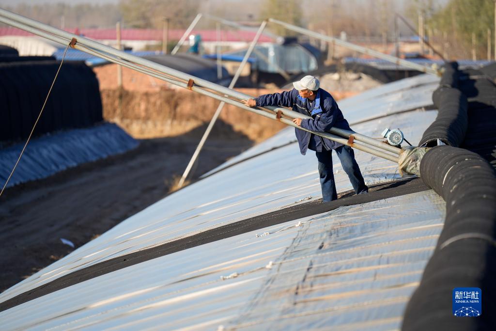 11月26日,河北省灤州市雷莊鎮后店子村農民在調整大棚保溫被。