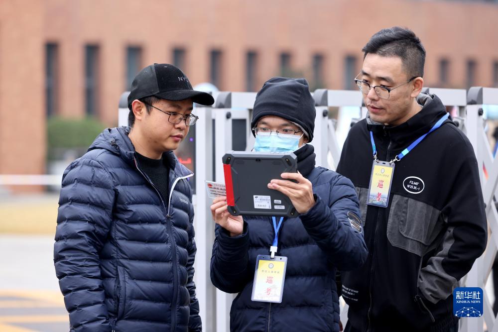 11月26日,在山東省棗莊市薛城區龍潭實驗學校考點,工作人員在核對考生信息。