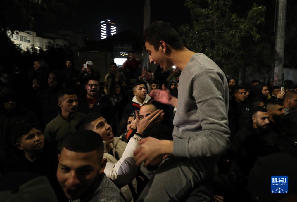 11月26日,在約旦河西岸城市拉姆安拉,人們慶祝被關押的巴勒斯坦人獲釋。