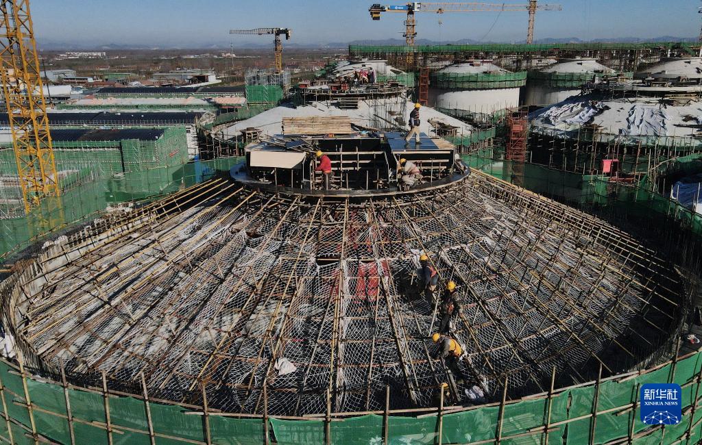 11月26日,工人在河北省唐山市豐潤區糧食安全應急儲備及食品深加工全鏈化綜合生產基地項目建設工地施工(無人機照片)。