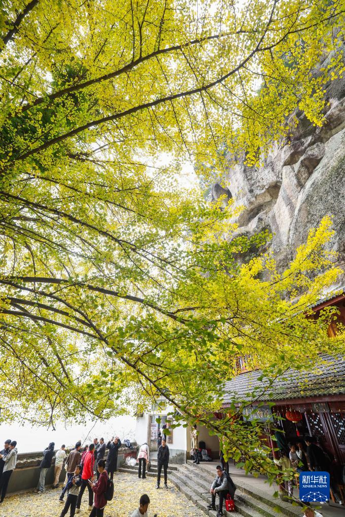 初冬時節(jié),浙江省建德市大慈巖懸空寺前的古銀杏樹披上“黃金甲”,漫天飛舞的銀杏“雨”,構(gòu)成一幅絕美的圖景,成為當(dāng)?shù)剜l(xiāng)村旅游的網(wǎng)紅打卡地。這棵古銀杏樹樹高39.5米,胸徑1.3米,曾入選“杭州十大最美古樹名木”,樹齡已有700多年,是建德的銀杏之王。