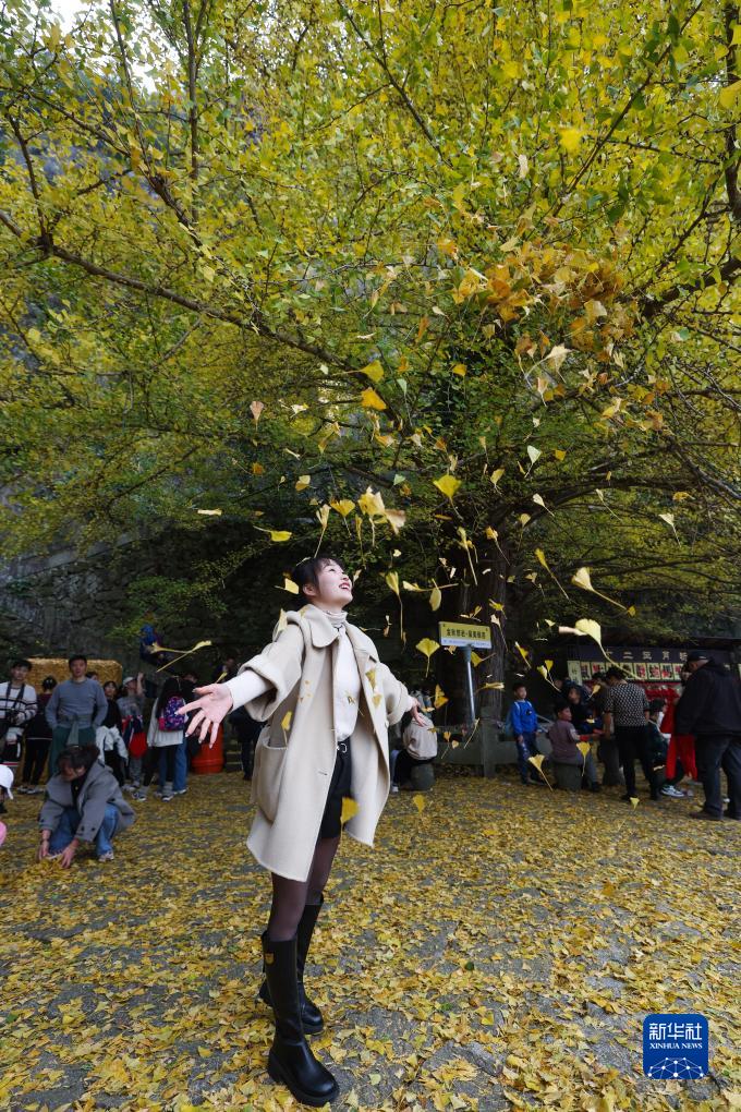 初冬時(shí)節(jié),浙江省建德市大慈巖懸空寺前的古銀杏樹披上“黃金甲”,漫天飛舞的銀杏“雨”,構(gòu)成一幅絕美的圖景,成為當(dāng)?shù)剜l(xiāng)村旅游的網(wǎng)紅打卡地。這棵古銀杏樹樹高39.5米,胸徑1.3米,曾入選“杭州十大最美古樹名木”,樹齡已有700多年,是建德的銀杏之王。