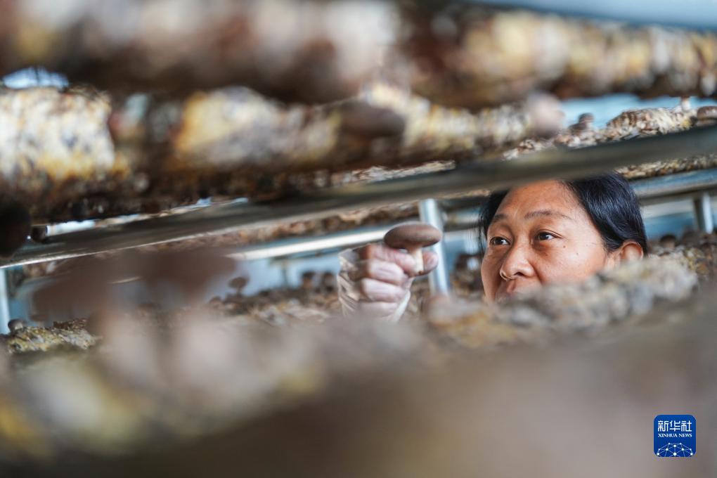 在平山縣食用菌制菌中心的香菇大棚內,崗南鎮冷泉村村民楊翠花采摘香菇(11月25日攝)。