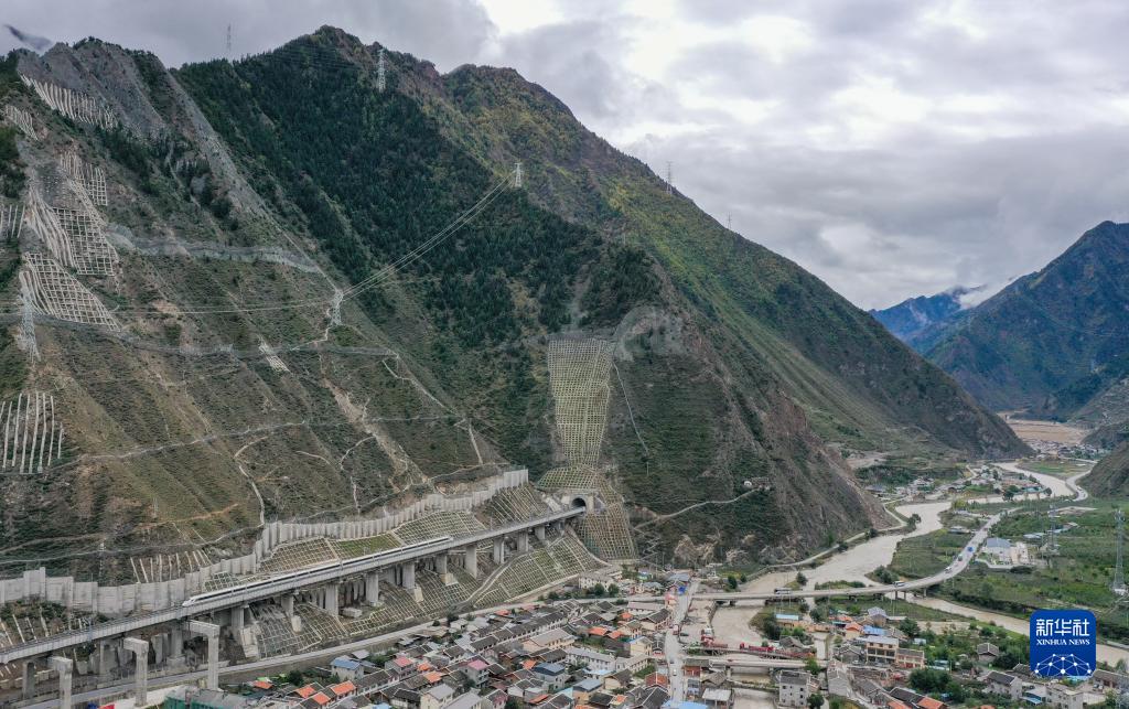調(diào)試列車駛出川青鐵路鎮(zhèn)江關站(10月12日攝,無人機照片)。