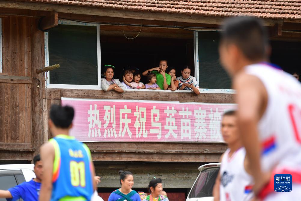 烏英苗寨村民在木樓里觀看窗外的籃球比賽(2019年7月19日攝)。