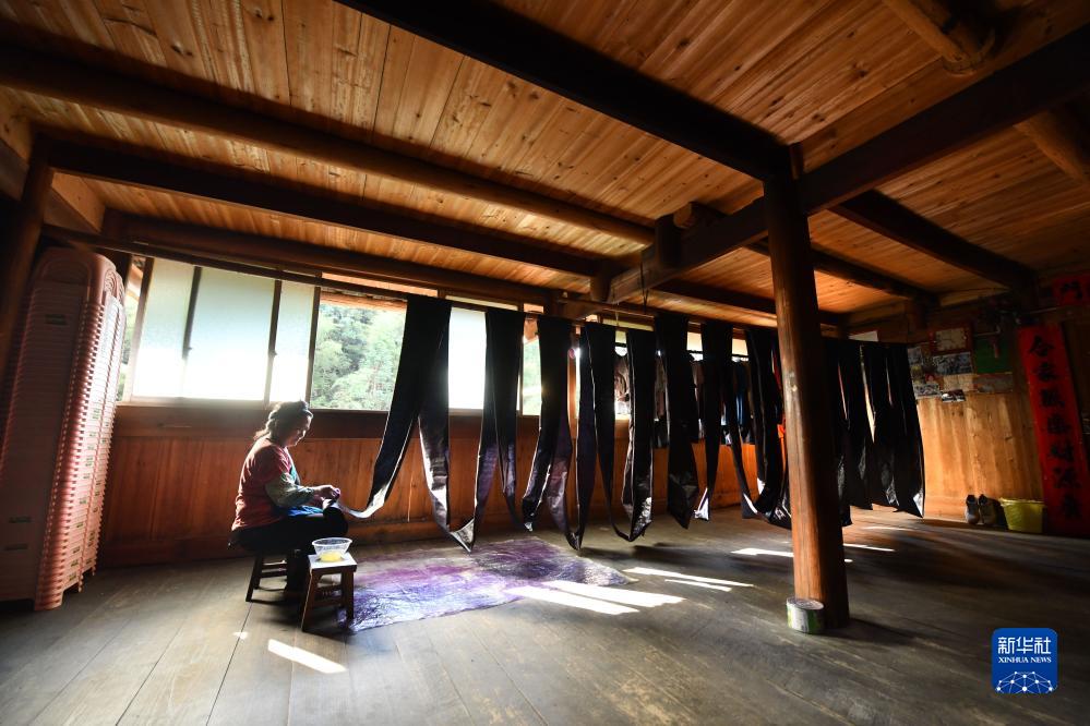 烏英苗寨婦女吳妹秋在晾曬亮布(2023年8月31日攝)。