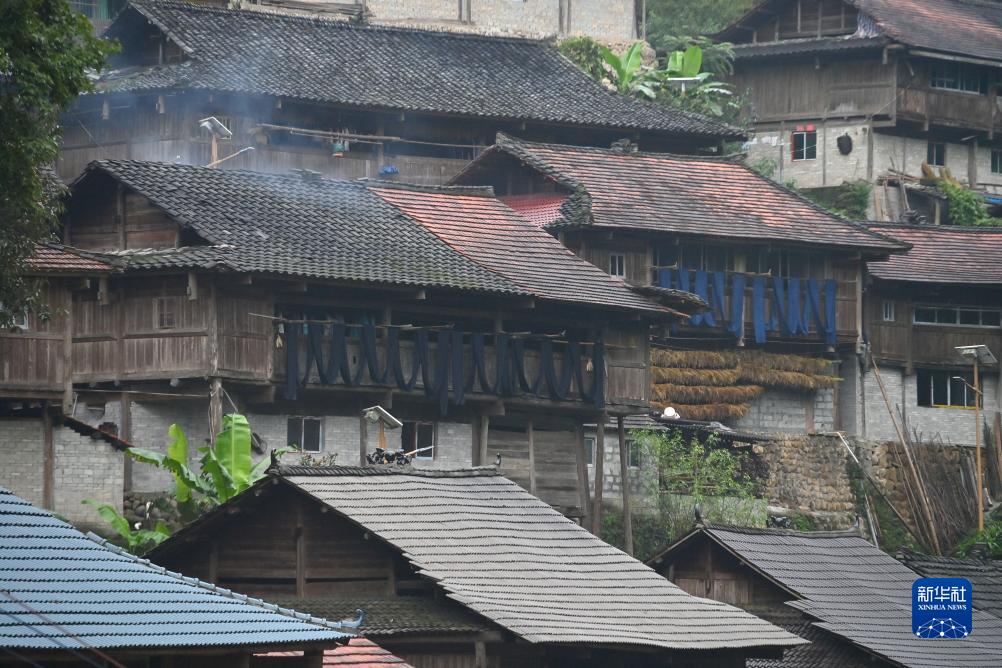 烏英苗寨村民在窗外晾曬亮布(2023年10月10日攝)。