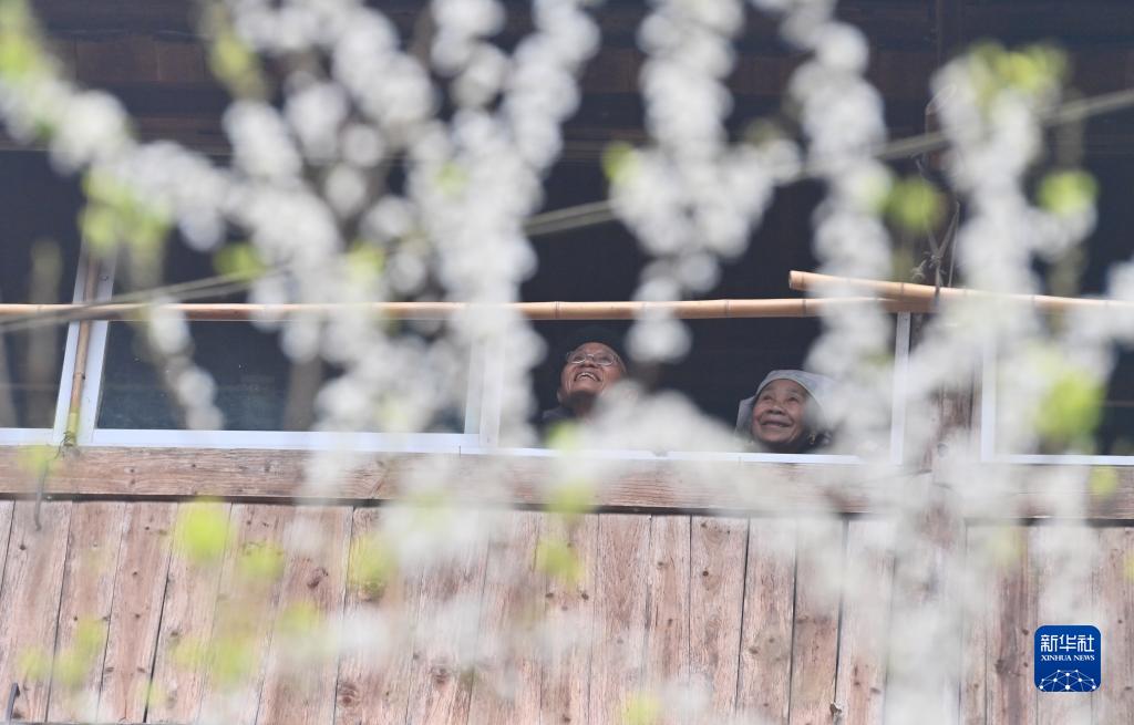烏英苗寨老人梁安合(左)和老伴在看窗外的風(fēng)景(2023年2月26日攝)。
