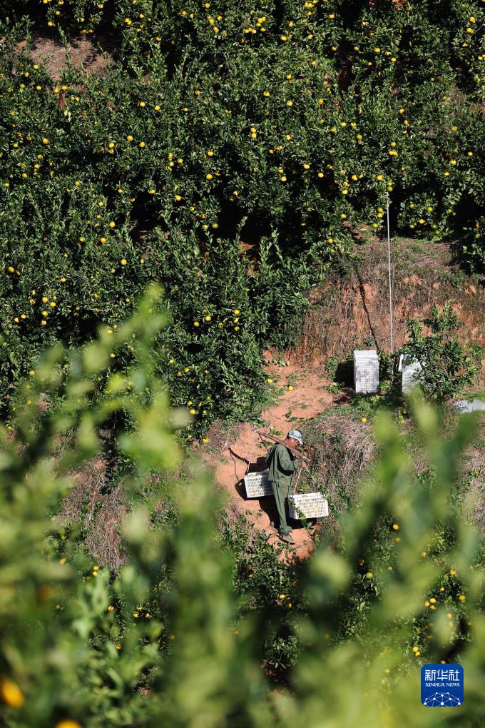 11月28日,在位于浙江省麗水市慶元縣黃壇村的外婆家水果專(zhuān)業(yè)合作社甜桔柚基地內(nèi),果農(nóng)在搬運(yùn)成熟的甜桔柚。