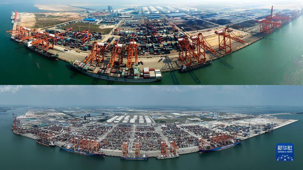 拼圖照片:上圖為2015年的欽州港(2015年10月23日攝,無人機照片);下圖為2022年的欽州港(2022年9月13日攝,無人機照片)。