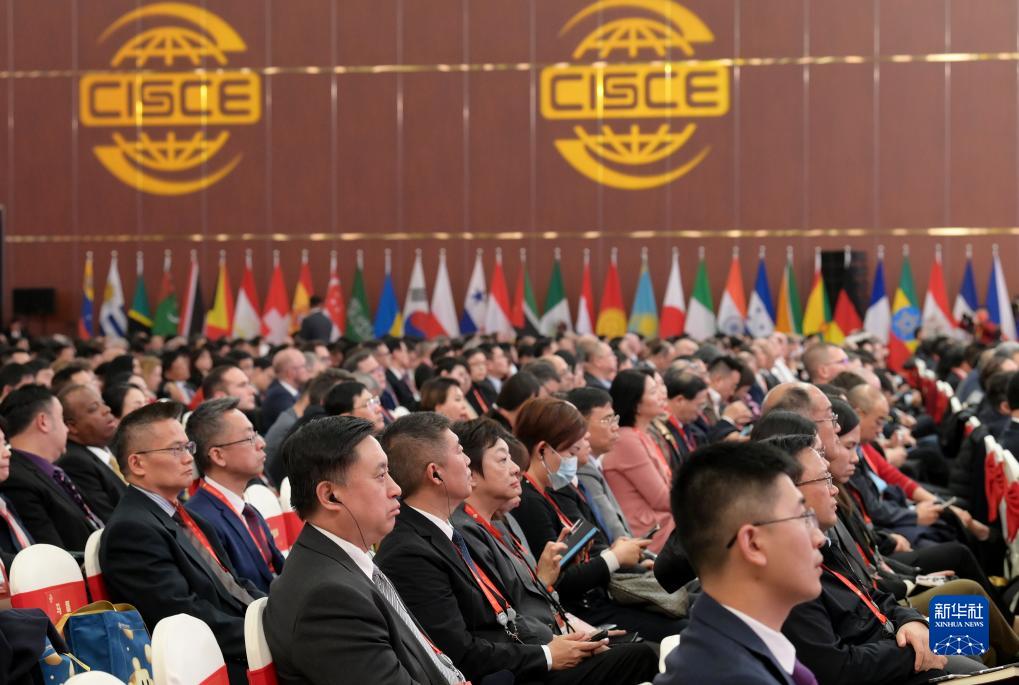 11月28日,中外與會嘉賓在博覽會開幕式現場聆聽主旨演講。