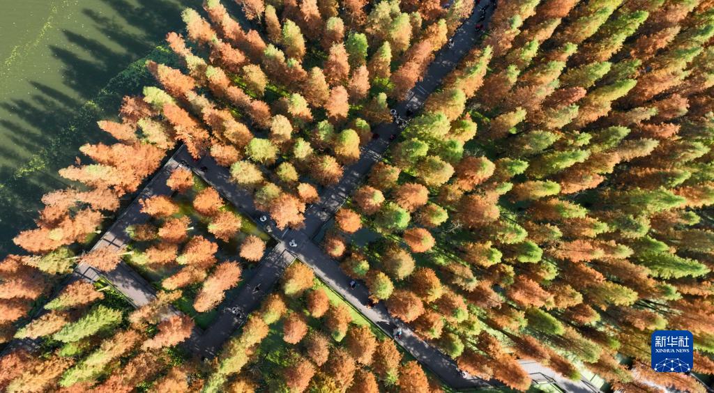 11月28日,游客在貴州省遵義市播州區播雅濕地公園觀賞水杉(無人機照片)。